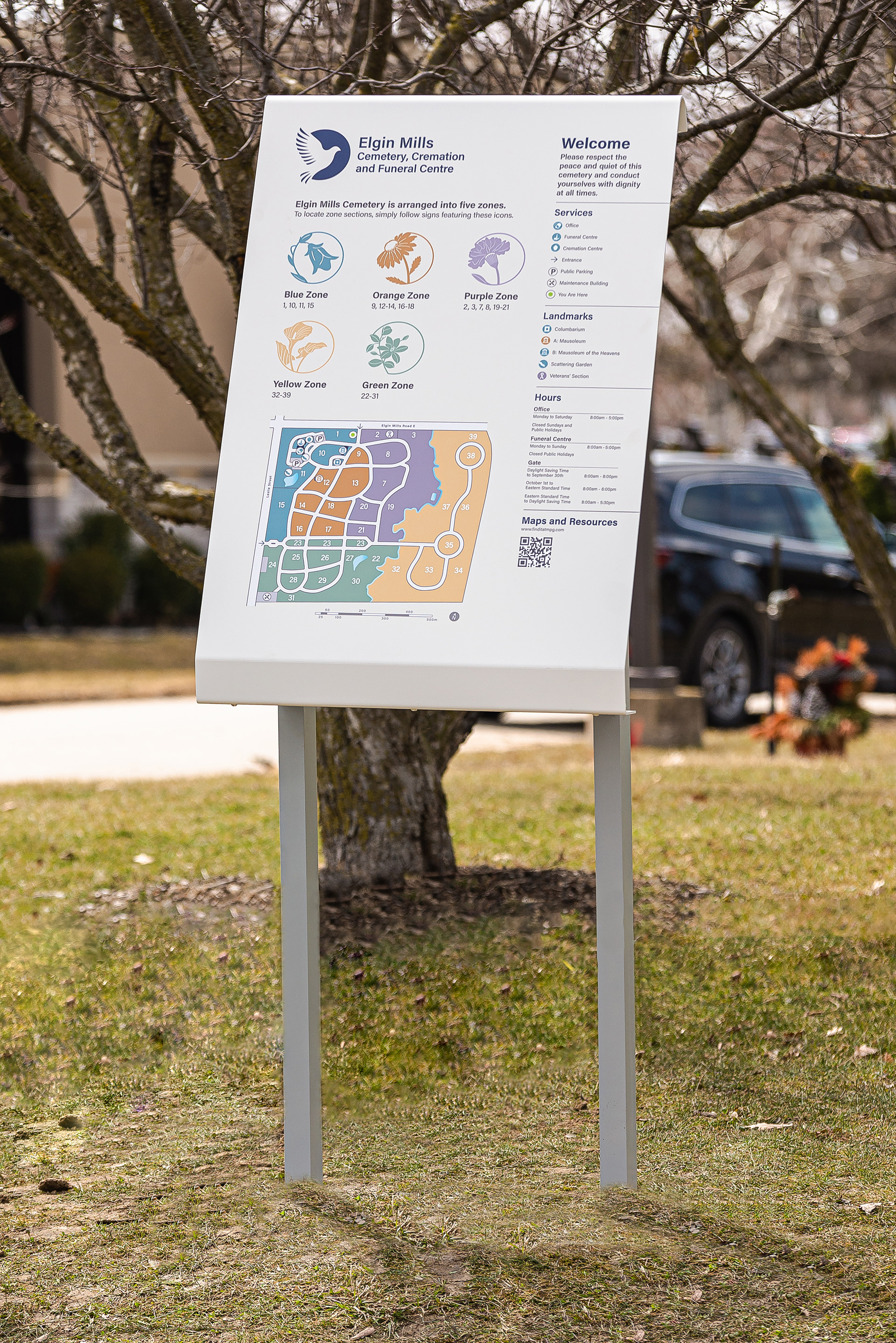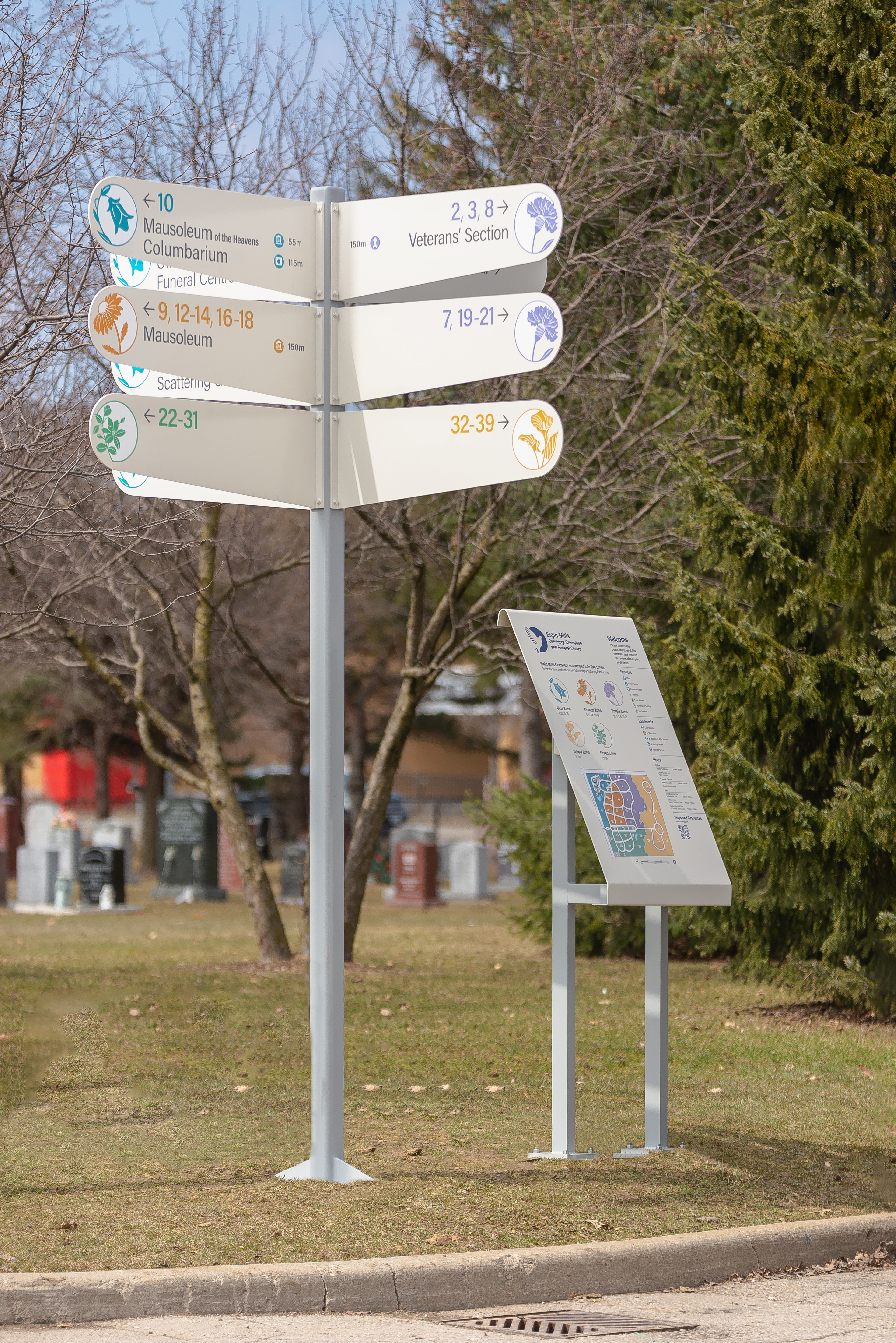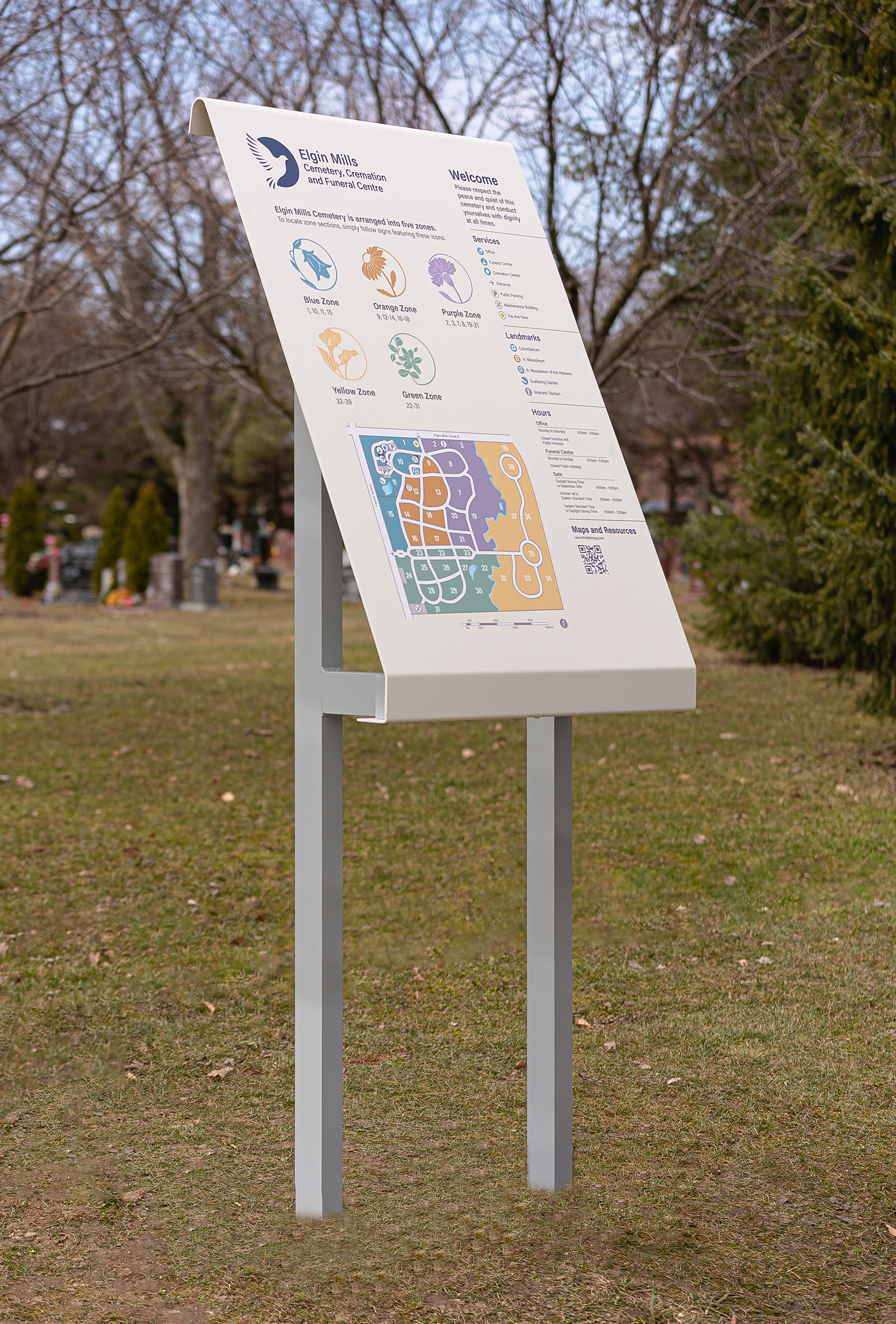 Worked as part of a team to compose a delicate signage system for a cemetery company in Toronto, Ontario. My main focus was the map graphics and messaging for the layouts. — Kramer Design Associates.